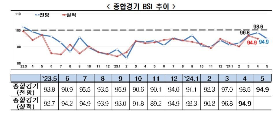 한국경제인협회가 24일 매출액 기준 600대 기업을 대상으로 BSI를 조사한 결과, 5월 BSI 전망치는 94.9를 기록하며 기준선 100을 하회했다. 이는 전월(98.6) 대비 3.7포인트 하락한 수치다.