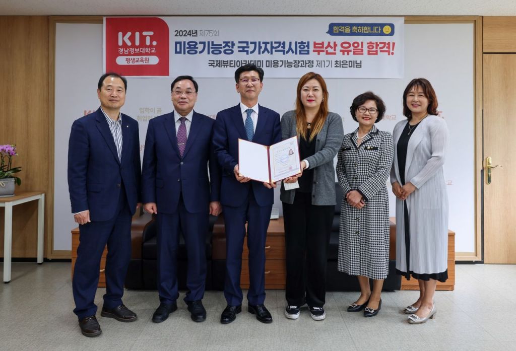경남정보대 평생교육원 최은미(왼쪽에서 4번째) 씨가 '제75회 미용기능장 시험'에 합격해 김태상 총장(왼쪽에서 3번째)과 함께 기뻐하고 있다.