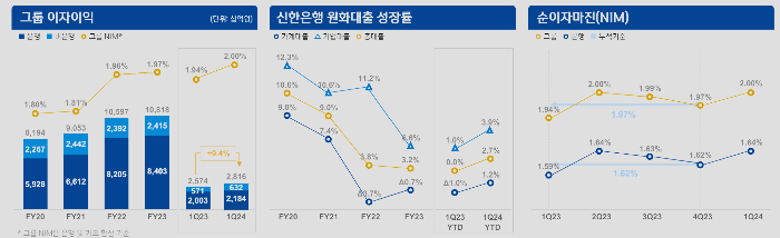 신한금융 역시 1분기 홍콩H지수 ELS 손실사태와 관련한 충당 부채로 2740억원을 적립했으나 주요 그룹사의 원화 대출금 확대와 수수료 이익 증가를 통해 이를 일정 부분 만회했다. 이자이익은 2조 8159억원으로 전년 동기 대비 9.4% 증가했다. 원화대출 성장률이 2.7%(가계 1.2%, 기업 3.9%)에 이르고 그룹의 분기 순이자마진(NIM)은 2.00%로 전년 동기 대비 6bp(1bp=0.01%) 개선된 데 따른 영향이다.