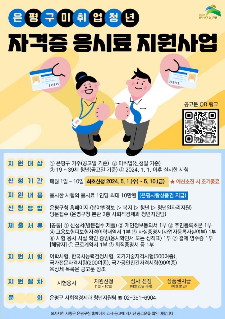 은평구(구청장 김미경)는 5월 1일부터 미취업 청년들의 취업 준비 비용 부담을 덜어주고 취업 경쟁력을 높이기 위해 ‘자격증 응시료 지원사업’을 시작한다고 밝혔다.