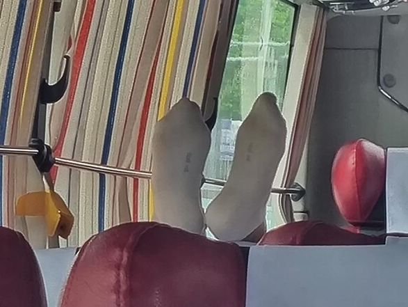 버스 앞좌석에 두 다리를 올려놓고 있는 승객. [사진=온라인 커뮤니티 갈무리]