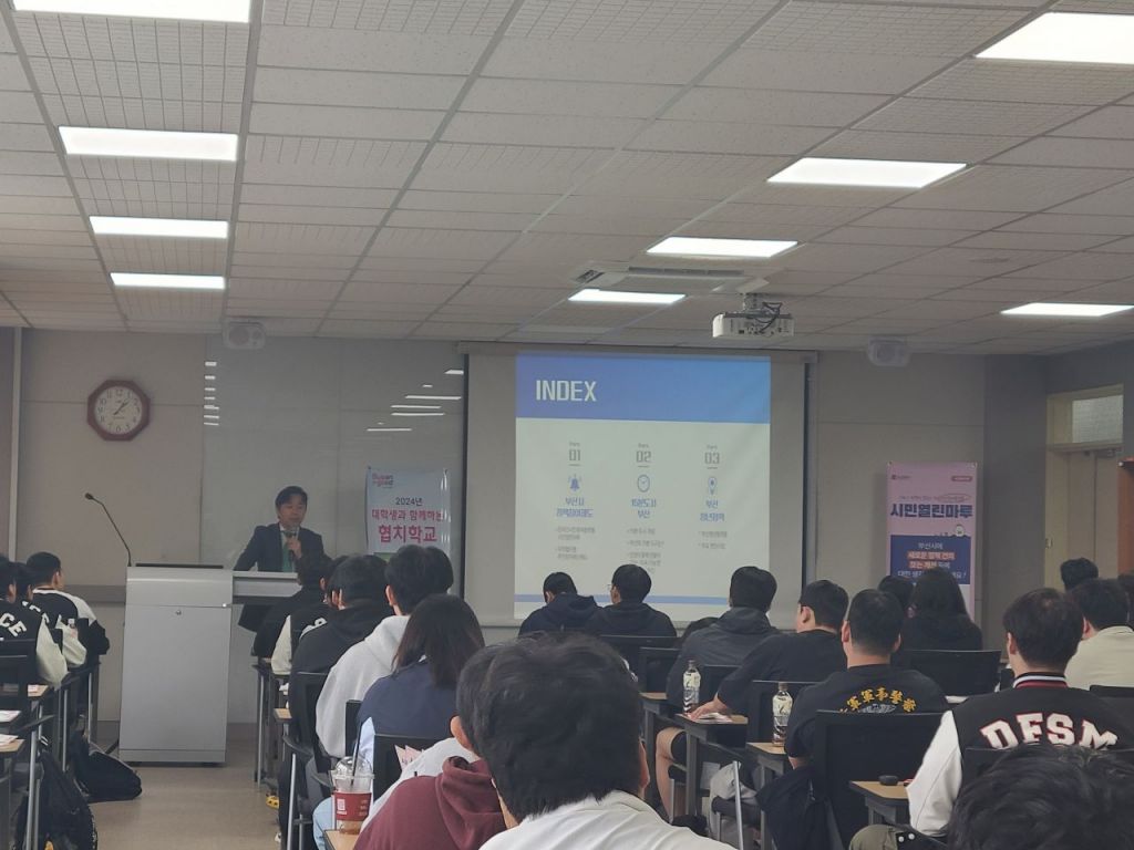 이날 특강을 진행한 부산시 박청일 갈등조정관은 “학생들이 지역 현안에 관심을 가지고 시정에 참여하는 프로세스를 이해함으로써 민관협치의 기반을 다지는 계기가 됐으면 한다”라고 전했다.