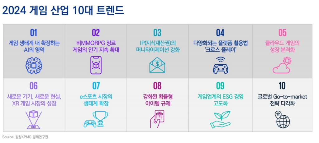 삼정KPMG가 3일 발간한 ‘2024 게임 산업 10대 트렌드’ 보고서에 따르면, 국내 게임 산업은 MMORPG 게임의 포화, 중국을 포함한 해외 국가의 게임 정책 변화, 기술 및 수요의 다양성과 같은 전환의 시기를 맞이해 비즈니스 모델 재수립이 필요한 시점이다.