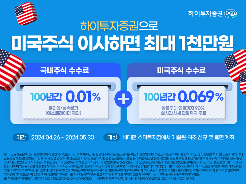 이벤트 기간 내 하이투자증권 스마트지점에 계좌를 신규로 개설하는 경우 미국 주식거래의 온라인 거래 수수료를 0.069%로 제공한다.