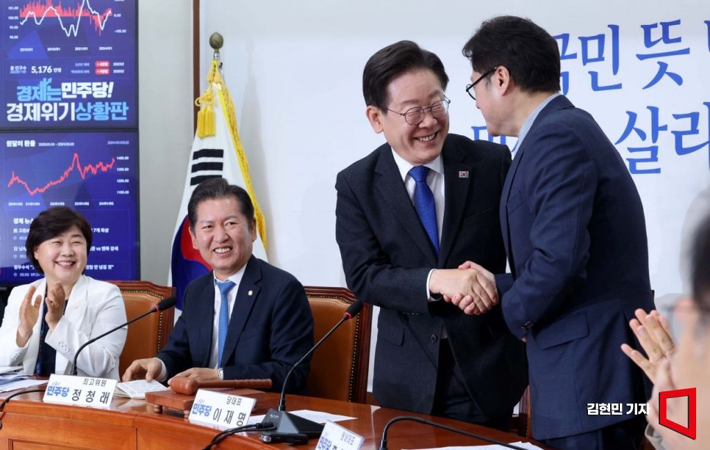 이재명 더불어민주당 대표가 3일 국회에서 열린 최고위원회의에서 홍익표 원내대표와 악수하며 격려하고 있다. 사진=김현민 기자 kimhyun81@