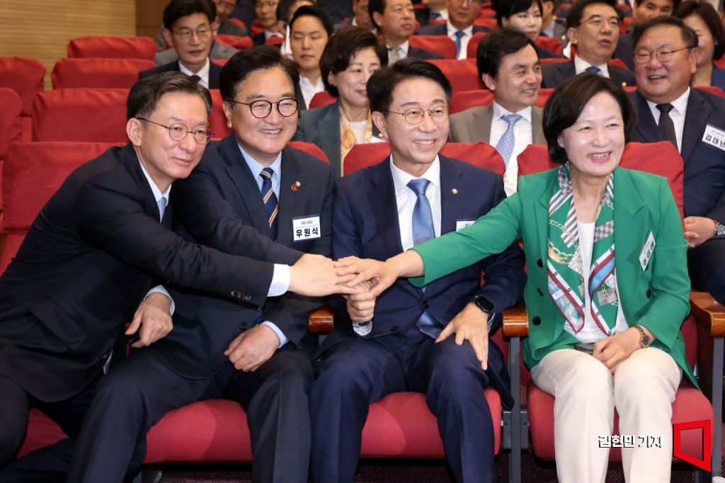 3일 국회 의원회관에서 열린 제22대 국회 더불어민주당 제1기 원내대표 선출 당선자 총회에서 정성호(왼쪽부터), 우원식, 조정식 의원과 추미애 당선인이 손을 맞잡고 있다. 사진=김현민 기자 kimhyun81@