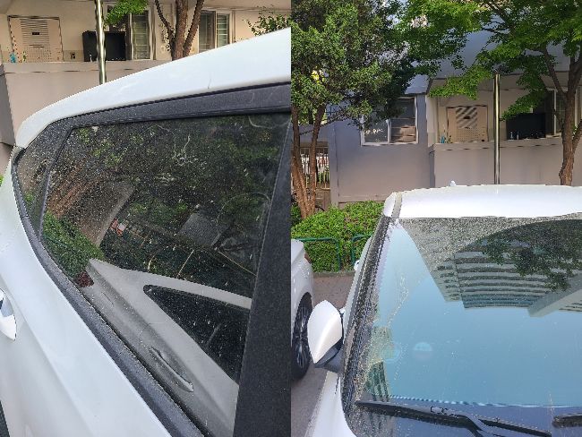 송홧가루가 차 앞, 옆면에 내려 앉은 모습.[사진=독자제공]