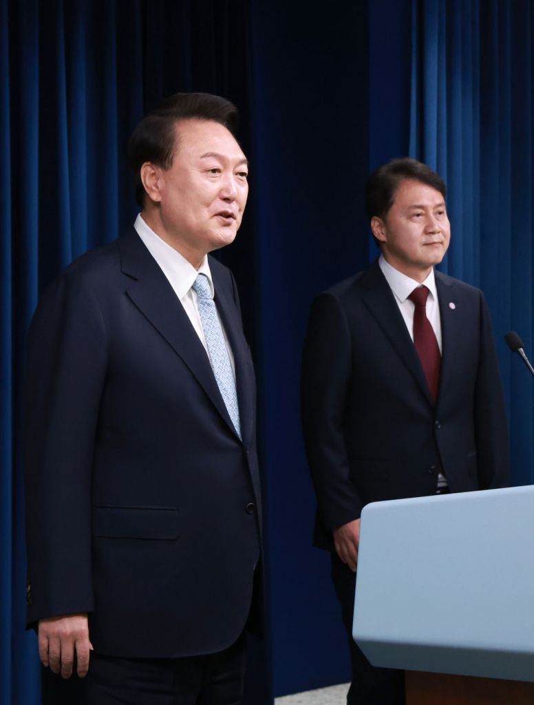 윤석열 대통령이 7일 서울 용산 대통령실 청사에서 신임 민정수석으로 내정한 김주현 전 법무차관을 소개하며 출입기자의 질문에 답하고 있다. [이미지출처=연합뉴스]