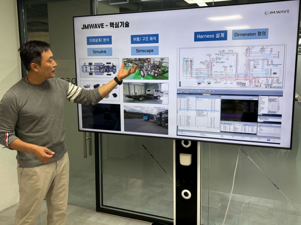 박정민 제이엠웨이브 대표가 내연기관 트럭을 전기차로 바꾸는 제이엠웨이브의 핵심기술에 대해 설명하고 있다.