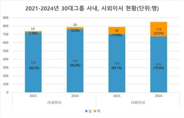 2021년 말에는 30대 그룹 중 이사회에 여성이 1명도 없는 그룹이 7개였으나, 현재는 모든 30대 그룹 이사회에 여성이 1명 이상 포진했다.