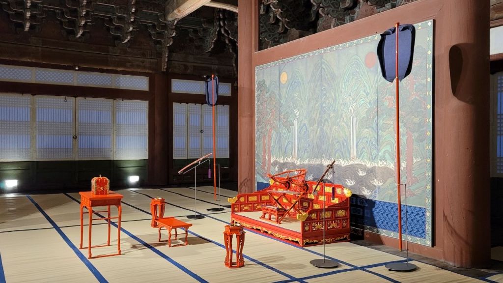 재현품은 하나같이 상참의가 열릴 때 사용된 것들이다. 가장 눈길을 끄는 건 어좌 위치 등을 고증해 제작·배치한 ‘용교의(임금이 앉는 의자)’와 ‘용평상(임금이 정무를 볼 때 앉은 평상).’ ‘왕은 맨바닥을 밟지 않는다’는 조선 시대 예법에 따라 지의(地衣·왕골로 엮은 돗자리)를 내부 바닥에 설치했다. 경복궁에 방문하면 누구나 자유롭게 관람할 수 있다.