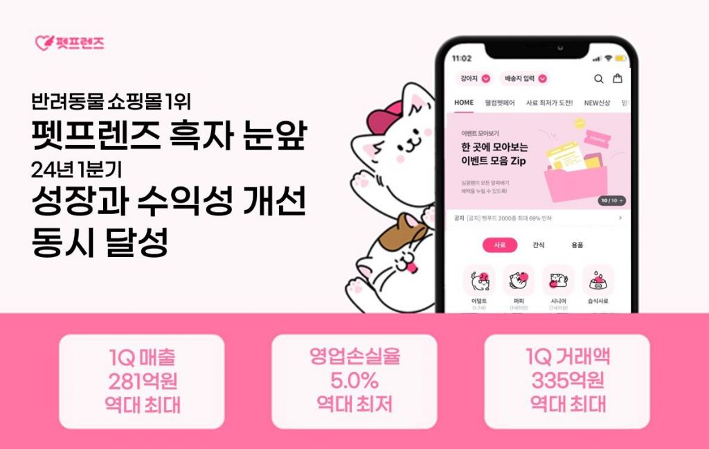펫프렌즈의 올해 1분기 영업손실은 14억원을 기록하면서 지난해(38억원) 대비 개선됐다. 영업손실률은 지난해 15.7%에서 올해 5.0% 줄면서 10.7%포인트 개선됐다. 같은 기간 거래액은 12.6% 성장한 335억원을 기록했다.