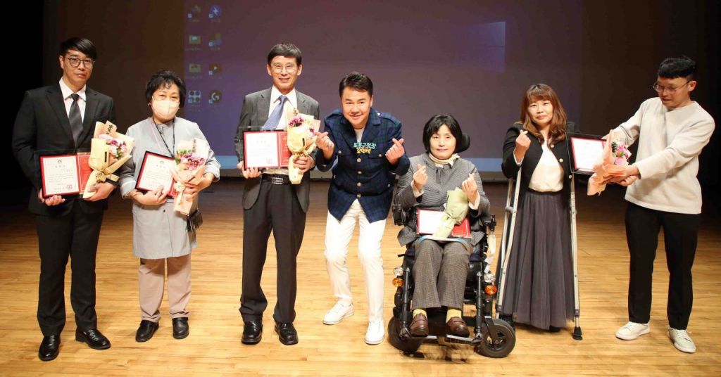 도봉구청(사진 가운데 오언석 구청장)은 지난달 19일 제44회 장애인의 날 기념행사에서 장애인 복지에 힘써 온 유공자에게 표창을 수여했다. 도봉구청 제공.