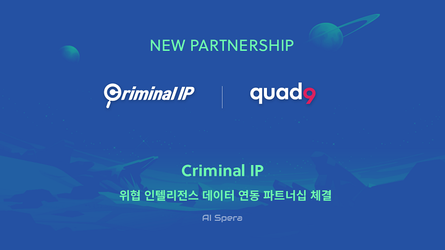 에이아이스페라는 IP 주소 및 도메인 기반의 위협 인텔리전스 검색엔진 ‘크리미널 IP’를 개발 및 서비스하는 국내 사이버 보안 기업으로, 수개월간의 데이터 검증 작업 끝에 데이터의 고유성과 높은 정확도를 인정받아 쿼드9과 데이터 연동 파트너십을 체결하게 되었다. 양사는 API 연동을 통해 에이아이스페라의 도메인 위협 정보와 쿼드9의 차단 데이터를 공유한다. 이로써 쿼드9은 도메인 위협 정보를 업데이트하여 엔드 유저를 보호하고, 에이아이스페라는 글로벌 TI 기업 데이터가 집약된 차단(악성) 데이터로 크리미널 IP의 정확도 향상에 활용할 수 있다.