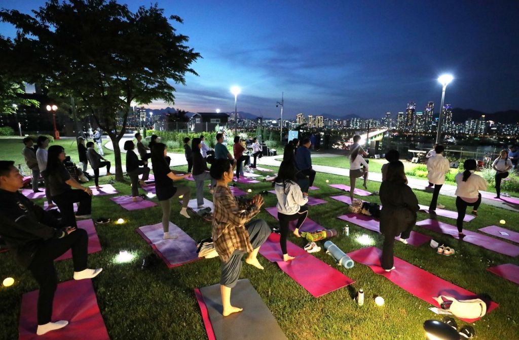 5월 10일 저녁 7~9시 강남구 삼성해맞이공원에서 열린 강남유닉투어 프로그램에 참여한 사람들이 요가와 필라테스를 즐기며 금요일 밤을 즐겼다.