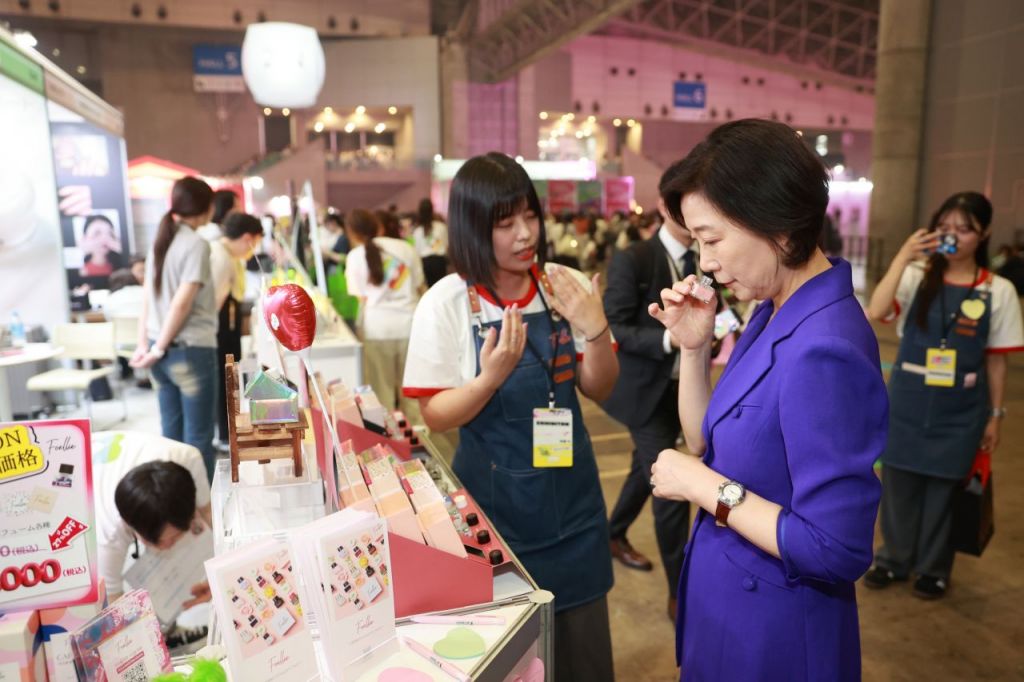 오영주 중소벤처기업부 장관이 11일 일본 도쿄에서 열린 'KCON JAPAN 2024' 연계 중소기업 제품 판촉 행사장을 방문해 현장을 둘러보며 제품을 체험하고 있다. [사진 제공=중소벤처기업부]