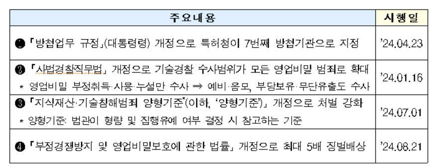 4중 안전장치는 ▲특허청의 방첩기관 지정 ▲기술경찰 수사 범위 확대 ▲국가기술의 해외유출 범죄 형량 상향 ▲영업비밀 침해에 상응한 징벌적 손해배상 한도 상향 등으로 집약된다.
