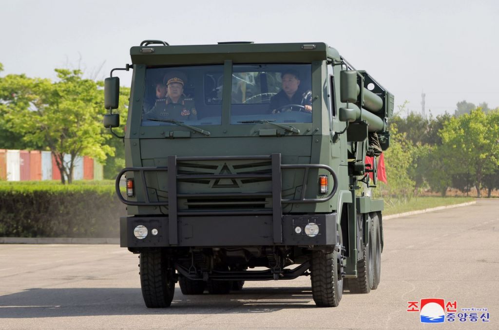 김정은 북한 국무위원장이 남측 수도권을 겨냥하는 신형 240㎜ 방사포를 탑재하는 이동식발사차량(TEL)을 직접 시운전하고 있다. [이미지출처=연합뉴스]