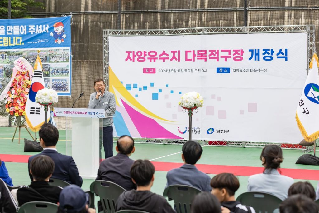 자양2동에 소재한 다목적구장은 면적 1023㎡ 규모로 조성됐다. 풋살장 1면이 설치돼 있고 족구장 겸용이 가능하다. 구 예산 1억4000만원을 투입, 8개월 넘는 노력 끝에 주민을 위한 체육시설로 변화시켰다.