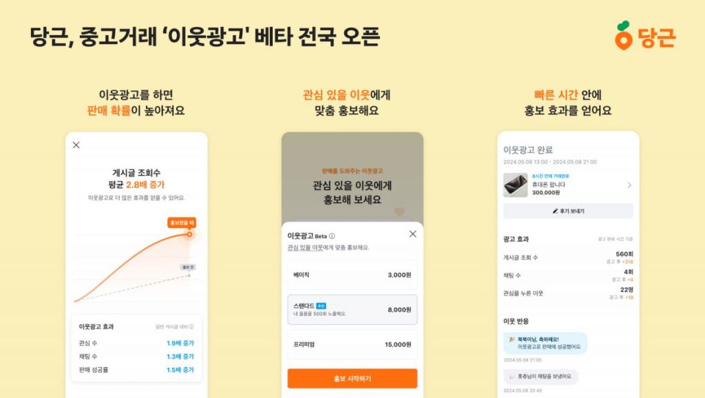 당근은 지난해 4월부터 제주를 시작으로 부산, 대구에서 약 1년간 이웃광고 테스트를 진행하며 그 효과와 수요를 확인했다. 시범 운영 결과 이웃광고를 사용한 게시글의 평균 조회수와 관심수는 각각 3배, 2배가량 높았고 평균 채팅 수도 30%가량 증가하며 판매율을 높이는 데 효과가 있는 것으로 나타났다.