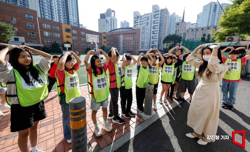 스승의날을 하루 앞둔 14일 서울 서초구 원명초등학교에서 어린이들이 선생님 '사랑해요'를 외치며 하트를 그리고 있다.