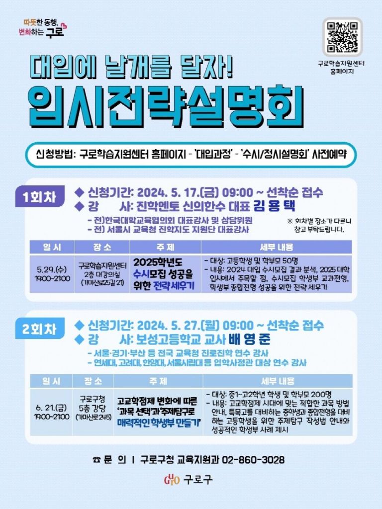 구로구(구청장 문헌일)가 대학 진학에 도움이 되는 정보를 제공하기 위해 입시전략설명회를 2회에 걸쳐 개최한다.