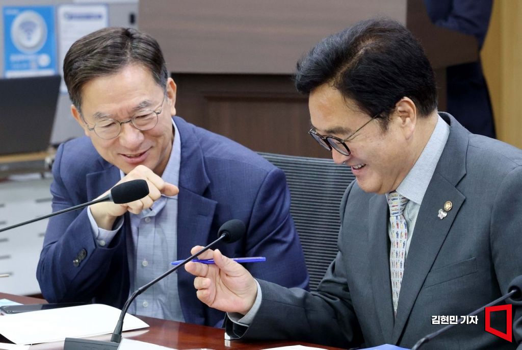 국회의장 출마에 나선 우원식 더불어민주당 의원과 후보직에서 사퇴한 정성호 의원이 14일 국회 의원회관에서 열린 더불어민주당 제22대 국회의원 당선자 의정활동 학습모임에서 대화하고 있다. 사진=김현민 기자 kimhyun81@