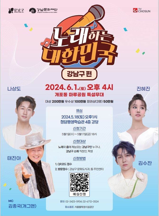강남구(구청장 조성명)가 6월 1일 오후 4~6시 30분 개포동 마루공원에서 ‘2024 노래하는 대한민국-강남구편’을 개최한다.