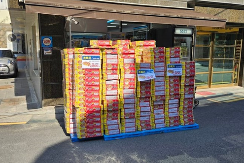 이 가운데 13일 서울 동작구 한 편의점에서 오뚜기 육개장을 산더미처럼 매장 앞에 쌓아놓고 파격 세일을 하고 있다는 사진이 사회관계망서비스(SNS)에 올라와 누리꾼의 시선을 끌었다. 해당 사진을 올린 글쓴이는 이날 온라인 커뮤니티에 "누군가 발주할 때 숫자를 잘못 입력한 듯하다"면서 집 근처 편의점 현황을 전했다.