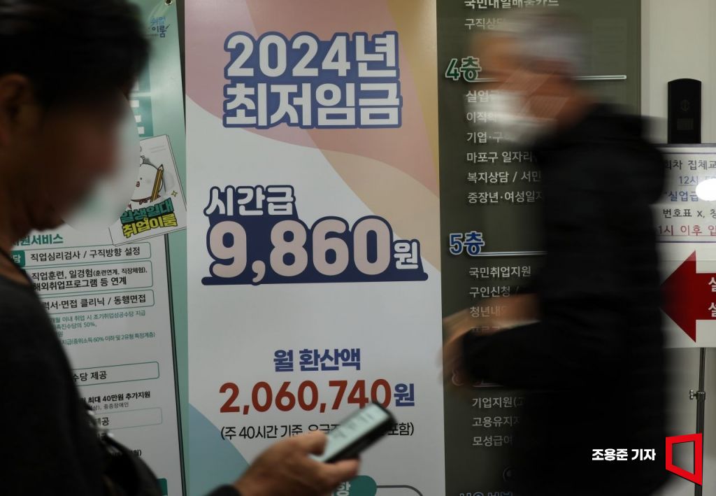 최저임금위원회 13대 위원의 임기가 시작된 14일 서울의 한 고용복지플러스센터에 2024년 최저임금 입간판이 설치되어 있다. 위원회는 다음주 내년 최저임금 심의를 위한 첫 전원회의를 열 예정이다. 사진=조용준 기자 jun21@