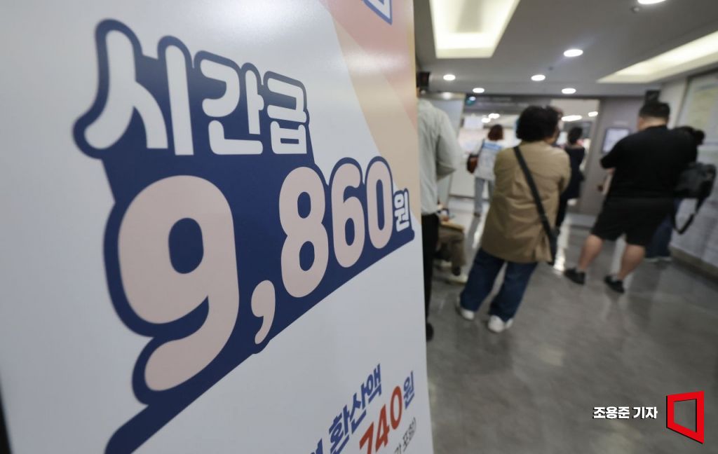 최저임금위원회 13대 위원의 임기가 시작된 14일 서울의 한 고용복지플러스센터에 2024년 최저임금 입간판이 설치되어 있다. 위원회는 다음주 내년 최저임금 심의를 위한 첫 전원회의를 열 예정이다. 사진=조용준 기자 jun21@