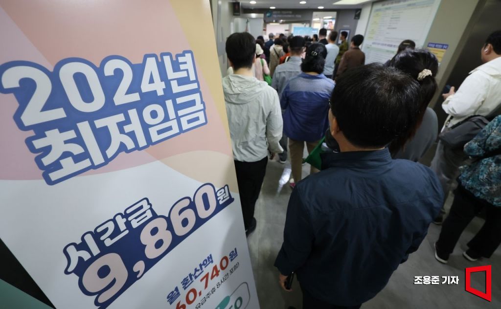 최저임금위원회 13대 위원의 임기가 시작된 14일 서울의 한 고용복지플러스센터에 2024년 최저임금 입간판이 설치되어 있다. 위원회는 다음주 내년 최저임금 심의를 위한 첫 전원회의를 열 예정이다. 사진=조용준 기자 jun21@