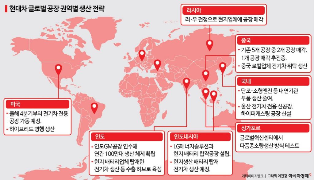 반면, 중국과 러시아에선 생산 규모를 줄이고 있다. 현대차는 중국에서 한때 5개의 공장을 가동했지만, 현재 2개 공장을 매각했으며 또 다른 1개 공장도 매각을 추진 중이다. 러시아 공장은 러시아-우크라이나 전쟁이 장기화되면서 결국 지난 1월 현지 업체에 헐값으로 넘겼다.