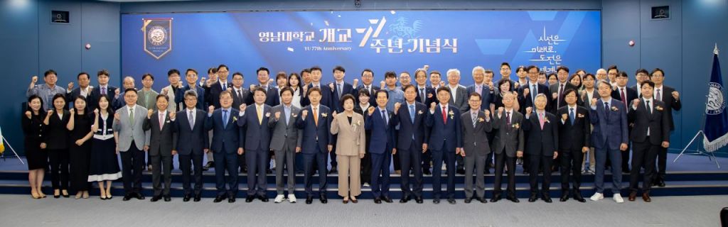지난 14일 오전 11시 영남대 천마아트센터 이시원글로벌컨벤션홀에서 열린 영남대 개교 77주년 기념식에는 조현일 경산시장, 정태일 전 영남대 총동창회장, 김기만 대구은행 부행장, 하인성 경북테크노파크 원장, 한재숙 학교법인 영남학원 이사장, 김진삼 이사, 이효수 제13대 영남대 총장, 서길수 제15대 영남대 총장, 이광식 명예교수회 회장, 김봉식 전 명예교수회 회장, 정재학 교수회 의장, 박영봉 직원노동조합 위원장, 유상원 총학생회장 등이 참석해 영남대 개교 77주년을 축하했다.
