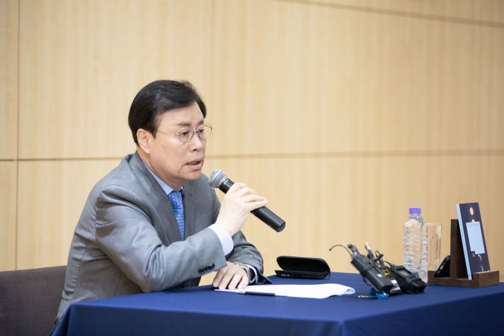 도종환 전 문화체육관광부 장관이 14일 창비서교빌딩에서 열린 새 시집 '정오에서 가장 먼 시간' 출간 기자간담회에서 등단 40주년을 맞은 소회를 밝히고 있다. [사진 제공= 창비]