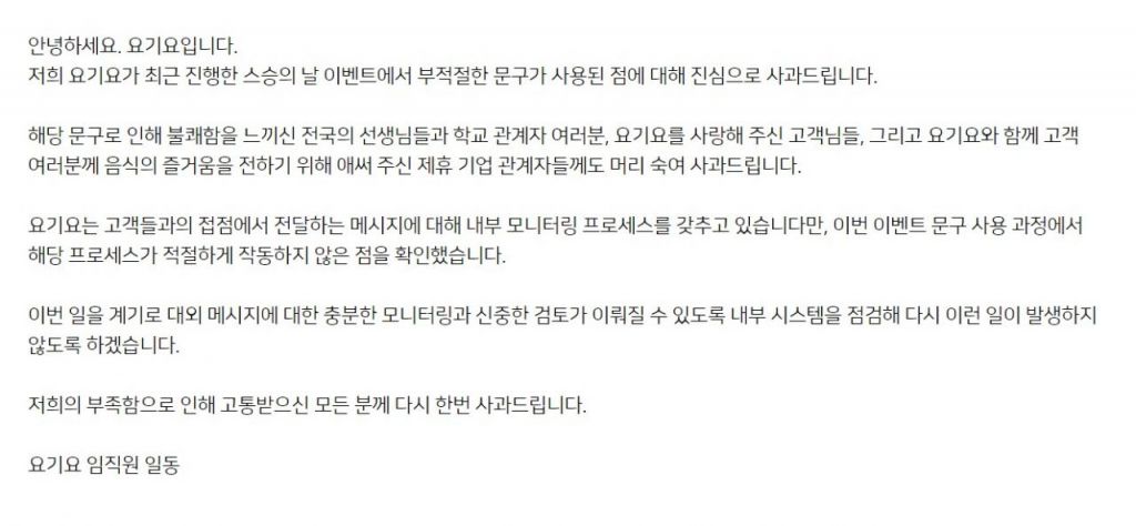앞서 요기요는 자사 스쿨푸드 이벤트 페이지에 '스쿨푸드 사주면 스승이라 부를게'라는 문구를 적었다. 이에 교사들을 조롱하는 마케팅이라는 비판이 불거졌다. 해당 이벤트 문구가 논란이 되자 스쿨푸드는 자사 홈페이지에 사과문을 게시했다.
