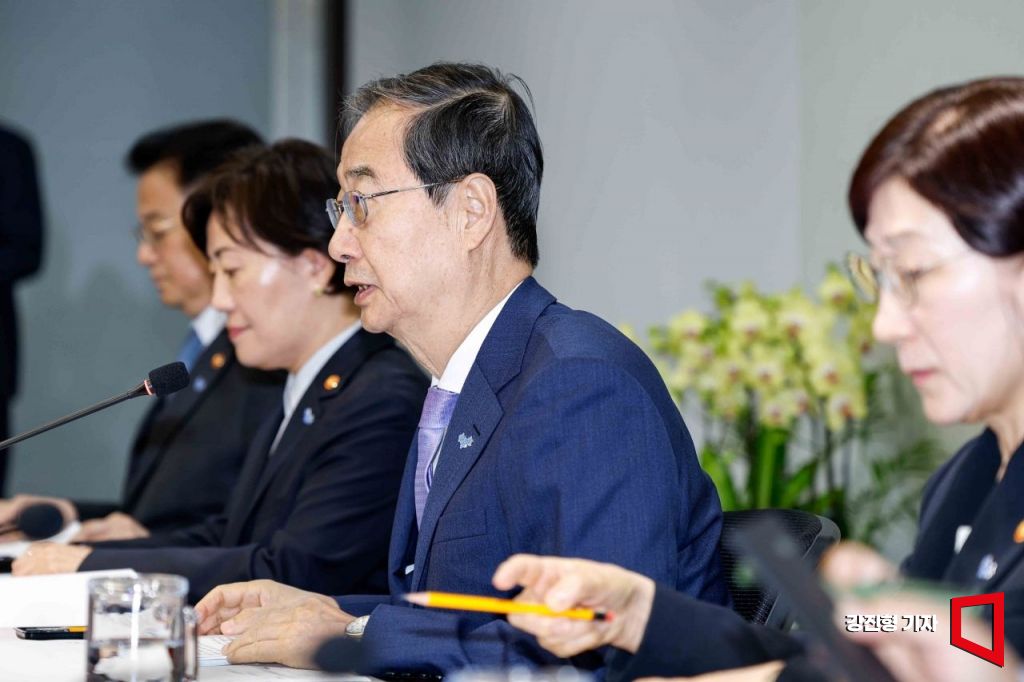 한덕수 국무총리가 16일 인천공항세관 특송물류센터에서 열린 국정현안관게장관회의에 참석해 모두발언 하고 있다. 사진=강진형 기자aymsdream@