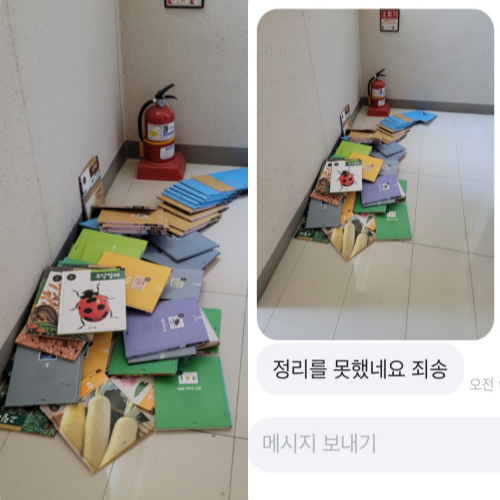 A씨가 공개한 사진을 보면, 여러 권의 아동용 책이 아파트 복도에 이리저리 널브러져 있는 것이 보인다. 마치 책으로 높게 탑을 쌓았다가 의도적으로 무너뜨린 모습이다. A씨는 "연락을 보자마자 이게 무슨 상황인가 싶었다. 처음에는 멍하더니 점점 기분이 나빠졌다"며 "누굴 거지로 아는 것 같다. 아니면 와서 쓰레기를 청소하라는 뜻인 건지"라며 당시 심정을 전했다.