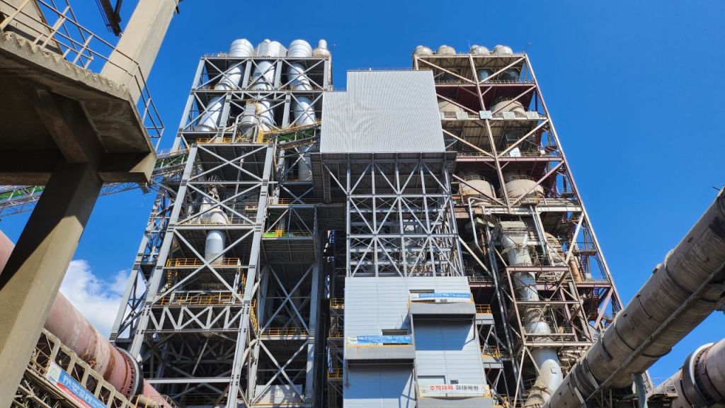 지난 16일 한일현대시멘트 영월공장 내 2호 킬른 예열탑 윗부분에 파이로 로터가 완비돼 있다. 파이로 로터는 왼쪽 윗부분이다.