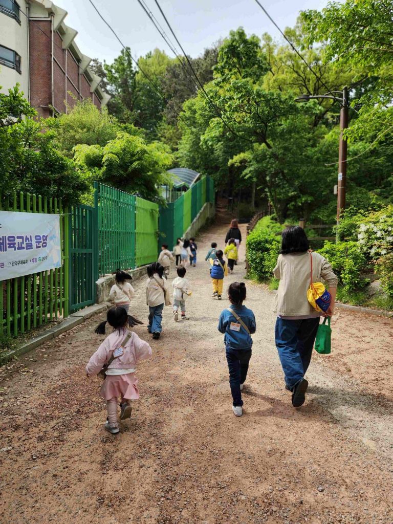 비콘 가방 메고 유아숲 가는 어린이들