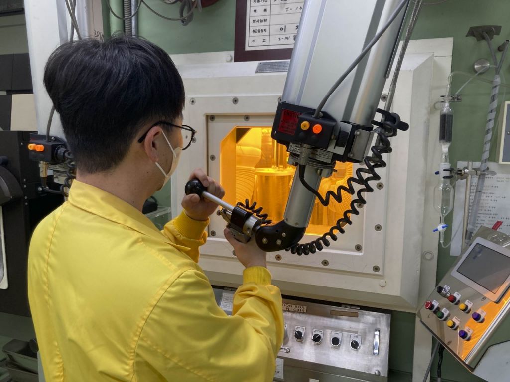 연구팀이 싸이로키티 주사액(I-131) 제조를 위해 핫셀을 조작하고 있다. 한국원자력연구원 제공