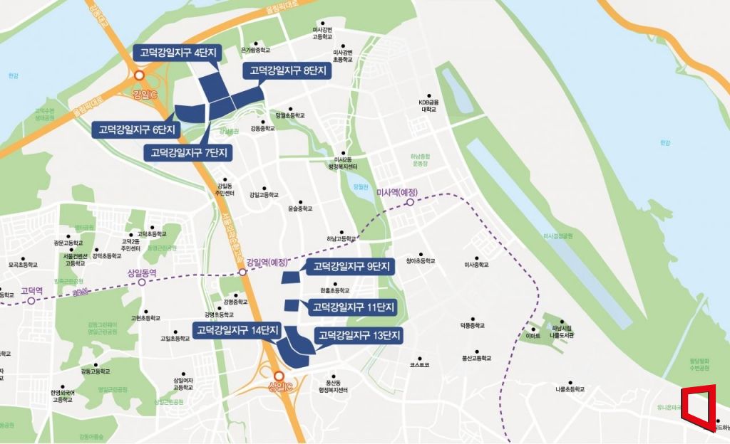 고덕강일지구는 강일·미사지구와 연계되는 우수한 입지조건과 6000여 가구의 대단지 배후수요를 가지고 있다. 이번에 분양하는 고덕강일지구 상가는 2020년 2월~2022년 4월 사이에 준공된 강동리버스트 4,6,7단지와 강동리엔파크9,11,13,14단지 내에 위치해 있다.