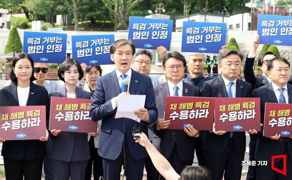 조국 조국혁신당 대표, 황운하 원내대표 등 당선인들이 20일 서울 용산구 대통령실앞에서 채 해병 특검 수용을 촉구하는 기자회견을 하고 있다. 사진=조용준 기자 jun21@