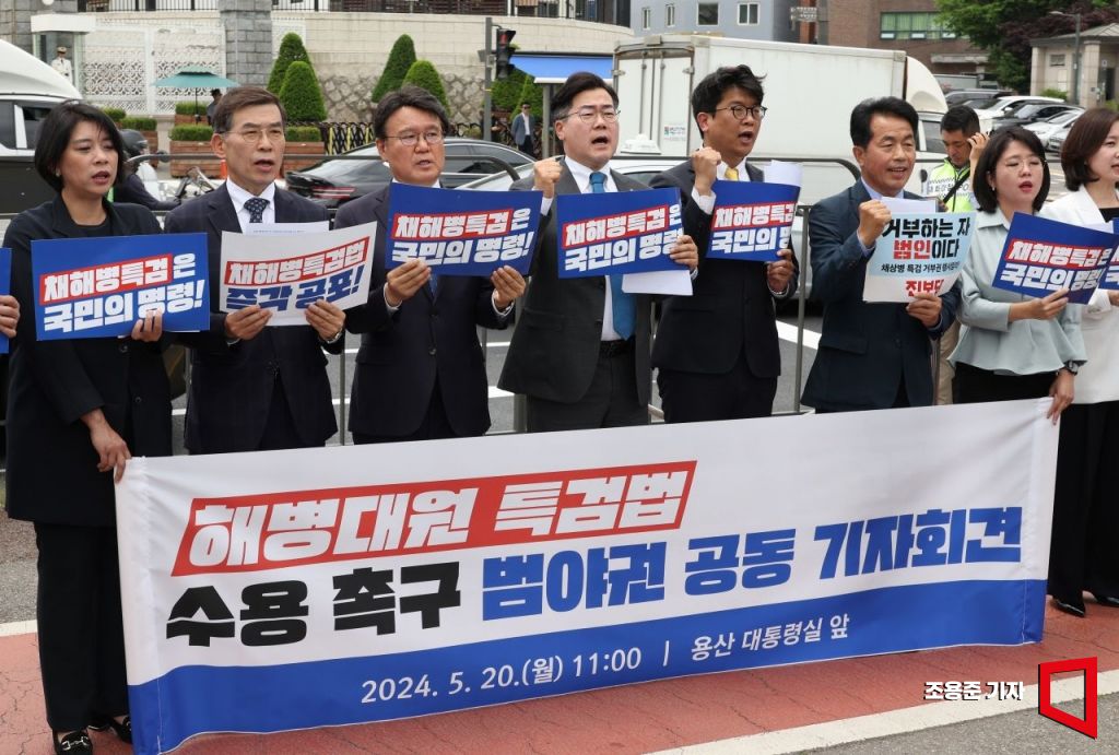 더불어민주당 박찬대 원내대표와 조국혁신당 황운하 원내대표, 개혁신당 허은아 대표 등이 20일 서울 용산 대통령실 앞에서 열린 '해병대원 특검법' 수용 촉구 범야권 공동 기자회견에서 구호를 외치고 있다. 사진=조용준 기자 jun21@