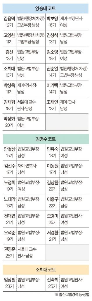 법률신문 분석 결과 연수원 16~28기까지 포진한 후보자 55명 가운데 현직 법관 또는 법관 출신 후보자는 51명으로 92.7%에 달했다. 양승태·김명수 코트 등 역대 대법관 구성의 대다수가 법관 출신인 점을 감안하면 이례적인 분포는 아니지만, 절대 다수가 법관 출신인 것이다.