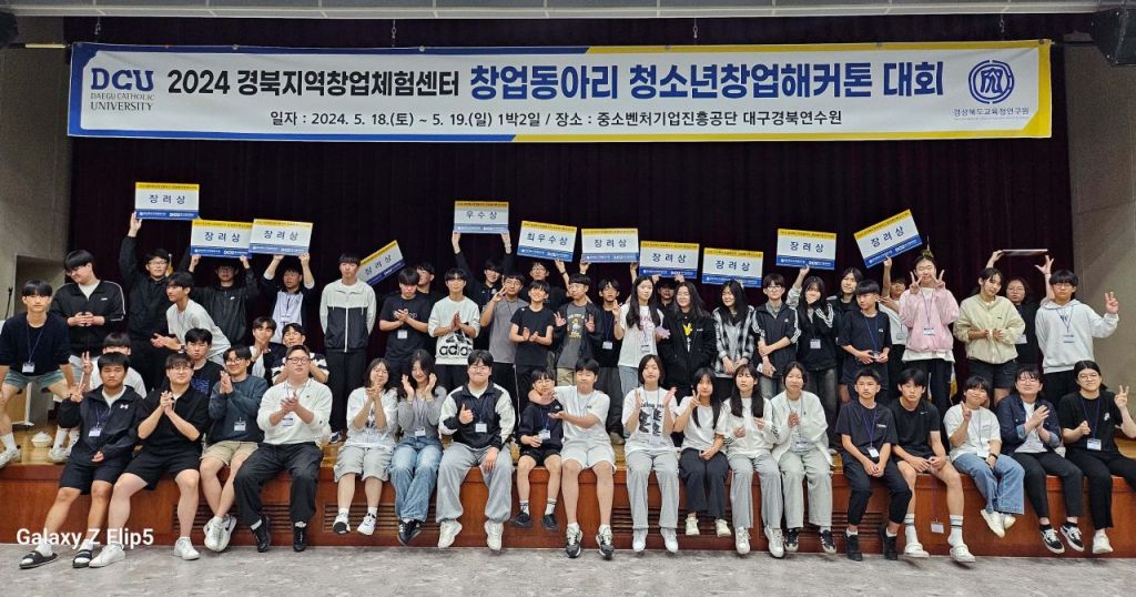 대구가톨릭대는 지난 18일부터 1박 2일간 ‘창업동아리 청소년 창업 해커톤 대회’를 개최하고 단체사진을 촬영하고 있다.