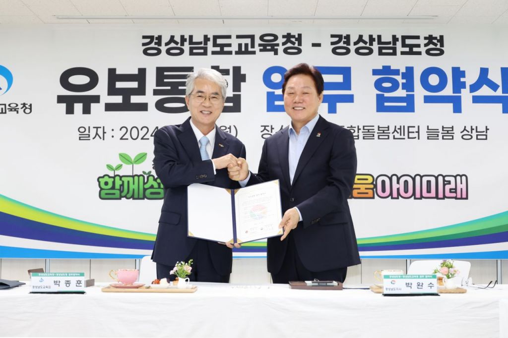 유보통합에 따라 지역 교육청으로 넘어오는 영유아 보육업무의 원활한 이관, 질 높은 영유아 교육 서비스 기반 조성 등을 통해 아이 키우기 좋은 경남 만들기에도 상호 노력한다.