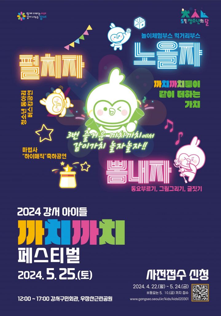 아동과 청소년을 위한 ‘2024 강서 아이들 까치까치 페스티벌’이 오는 25일 오후 1시 강서구민회관과 우장근린공원 일대에서 열린다. 까치까치 페스티벌은 5월 청소년의 달을 맞아 우리나라의 미래인 아동, 청소년들이 마음껏 뛰어놀며 끼와 재능을 뽐낼 수 있도록 마련한 행사다.