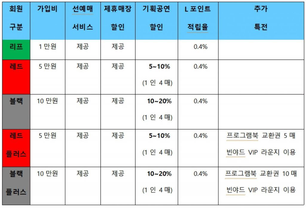 또한 24세 이하 청년들을 위한 빈야드 리프 회원제를 신설한다. 청년층이 회원제 서비스를 누릴 수 있도록 배려한 빈야드 리프의 회원 가입비는 1만원으로, 가입비가 10만원, 5만원인 빈야드 블랙과 레드 회원에 비해 저렴하다. 빈야드 리프 회원은 기획공연 선예매 서비스, 기회공연 관람 종료후 L 포인트 적립, 롯데뮤지엄 등 제휴매장 할인 혜택을 받을 수 있다.
