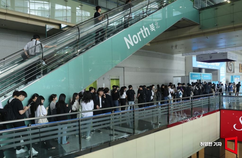 21일 서울 코엑스에서 열린 중견기업 일자리 박람회를 찾은 구직자들이 입장을 위해 등록데스크 앞에 줄을 서 기다리고 있다.